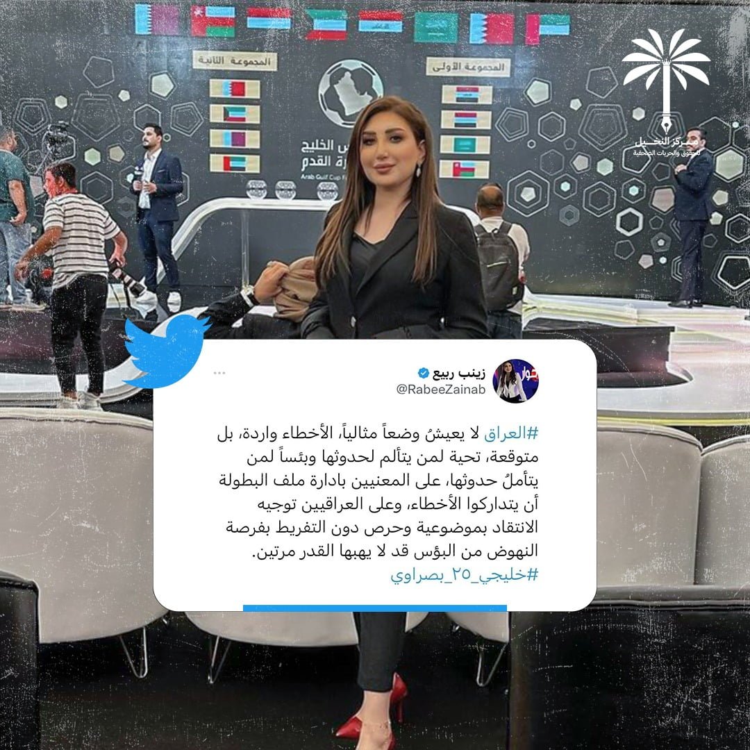 أكدت رئيسة رئيس مركز النخيل للحقوق والحريات الإعلامية زينب ربيع اهمية يتدارك الأخطاء قبل انطلاق بطولة خليجي 25 في البصرة، داعية الى توجيه الانتقاد بموضوعية وحرص دون التفريط بفرصة النهوض.