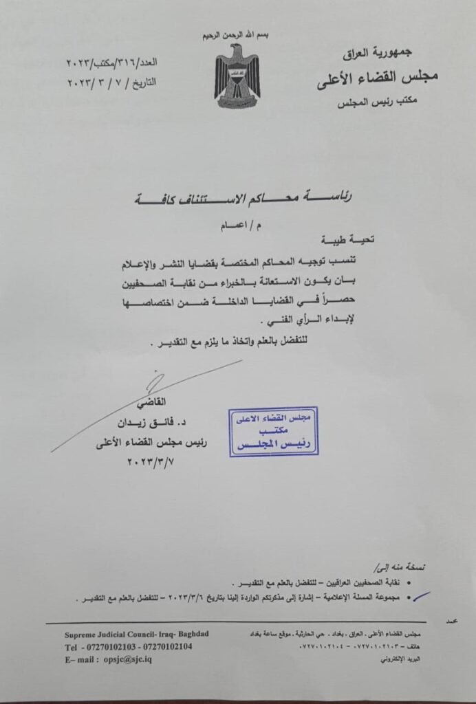 وجه رئيس القضاء الأعلى الدكتور فائق زيدان رئاسة محاكم الاستئناف بأن يكون الاستعانة بالخبراء من نقابة الصحفيين العراقيين حصراً في قضايا النشر والإعلام لإبداء الرأي الفني.