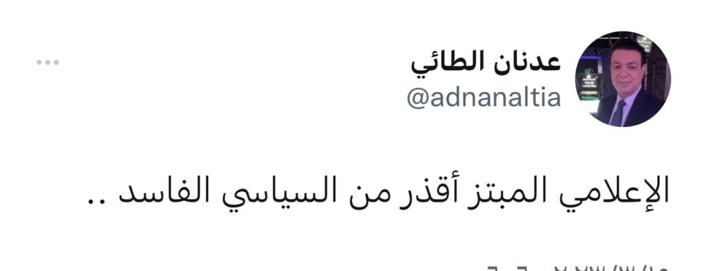 وصف الاعلإمي عدنان الطائي، اليوم الاربعاء، الإعلامي المبتز بأنه “أقذر من السياسي الفاسد”، على حد تعبيره.