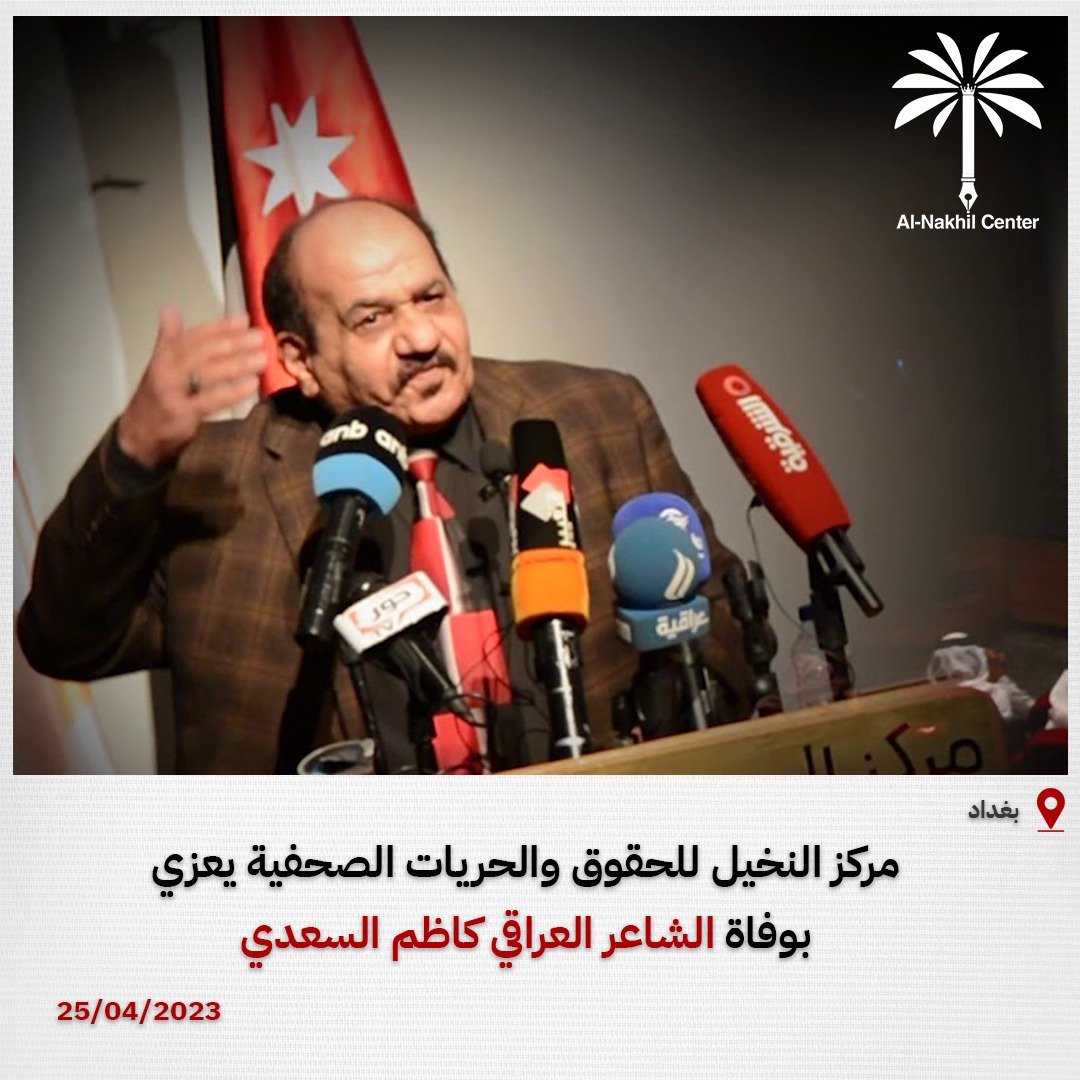 يعزي مركز النخيل للحقوق والحريات الصحفية بوفاة الشاعر العراقي كاظم السعدي إثر صراع طويل مع المرض.