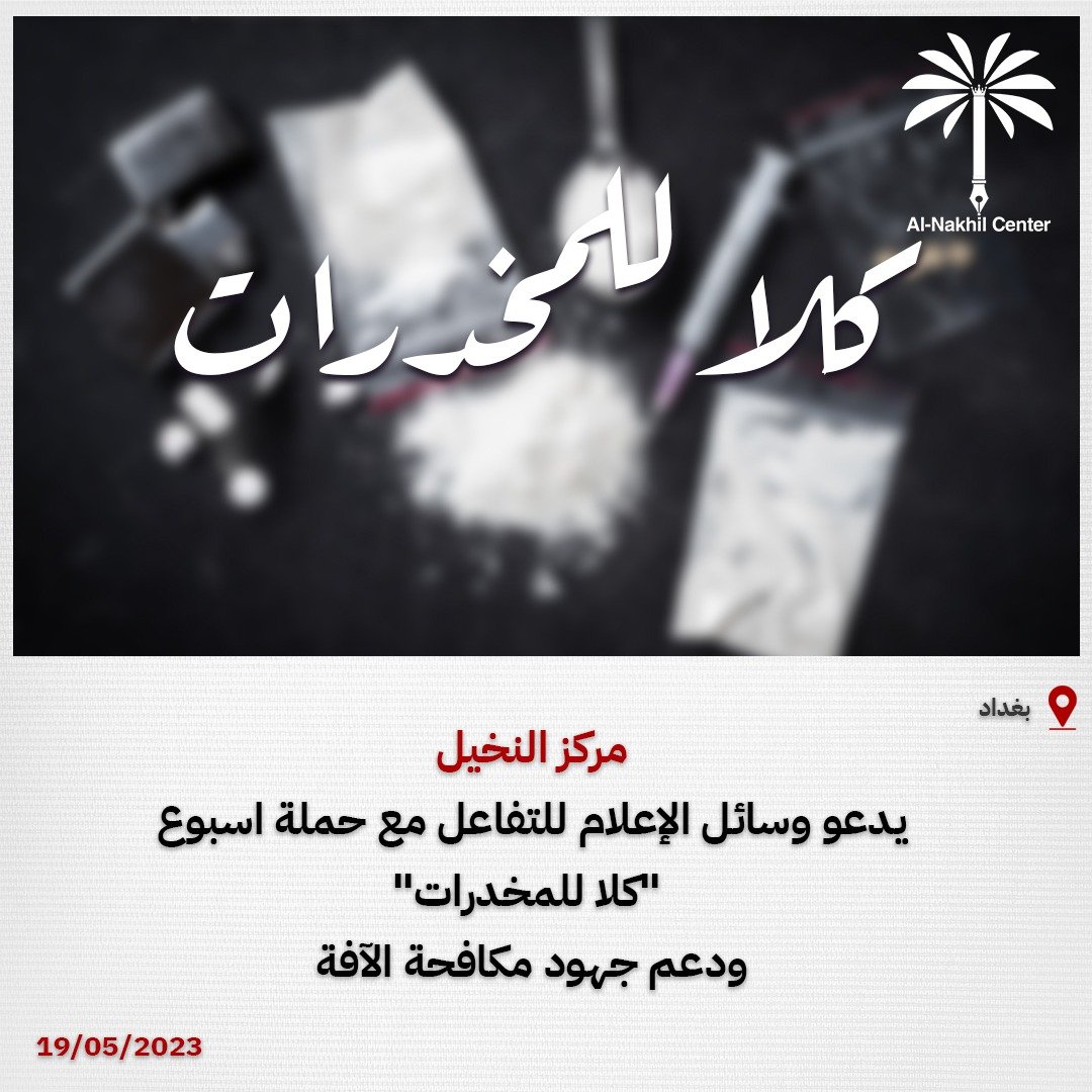 يدعو مركز النخيل للحقوق والحريات الصحفية، وسائل الإعلام المختلفة ومنصات التواصل الاجتماعي الى التفاعل مع حملة أسبوع مكافحة المخدرات (كلا للمخدرات) التي اطلقتها وزارة الداخلية اليوم.