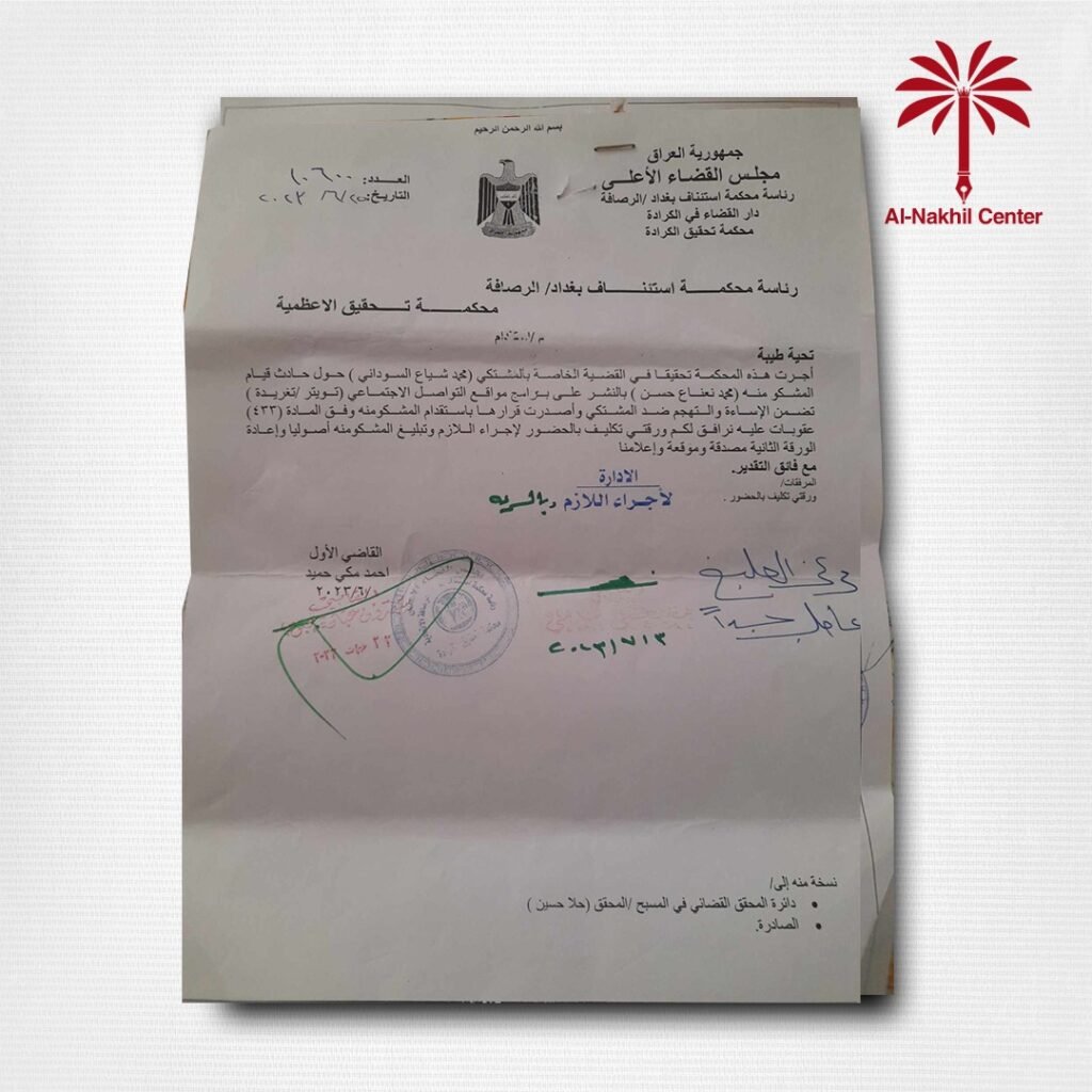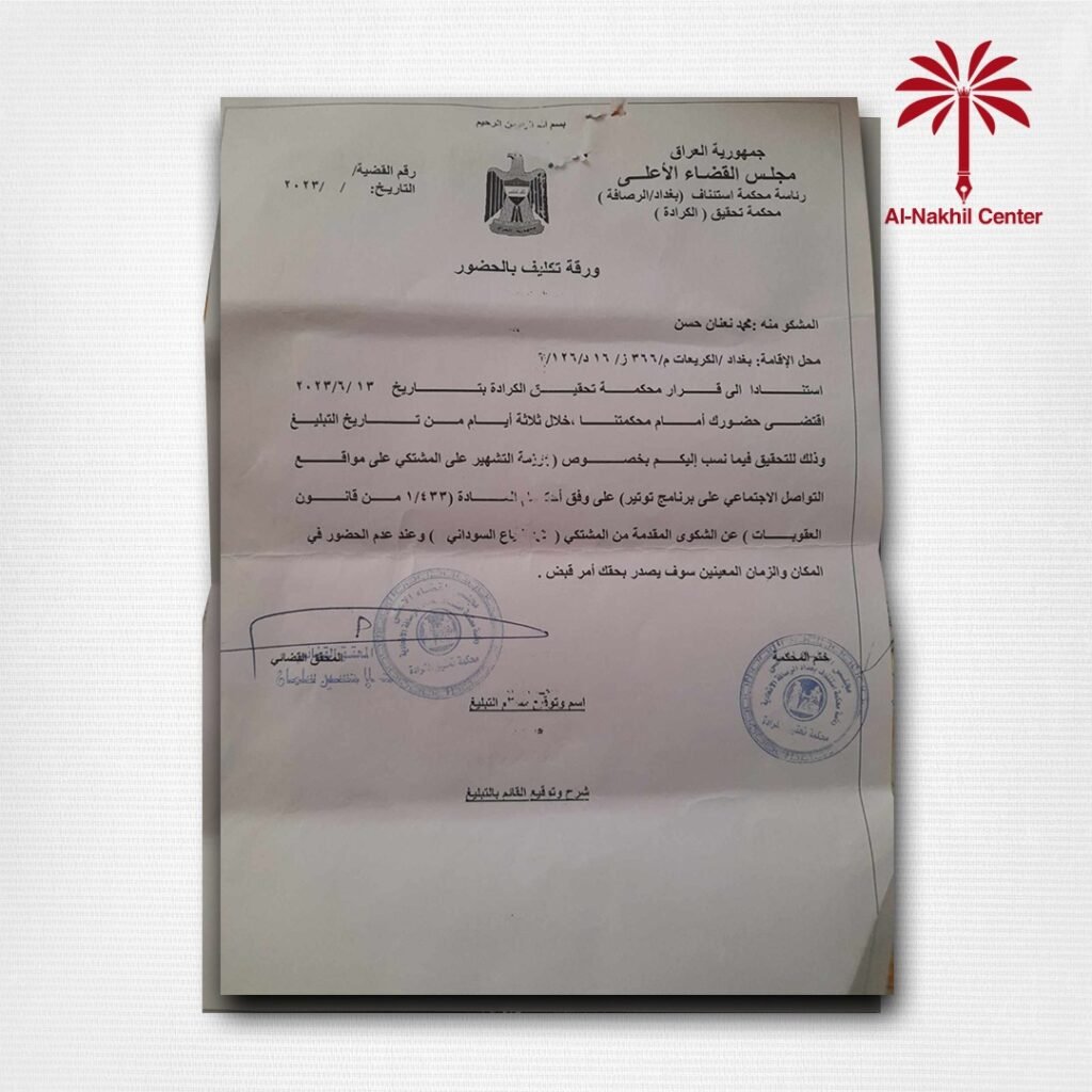 وقال الدكتور نعناع في تصريح لـ”النخيل نيوز”، إن “تلقى بلاغا من محكمة تحقيق الكرادة، اليوم، بالحضور خلال فترة ثلاثة أيام بناء على الدعوى المرفوعة من رئيس مجلس الوزراء محمد شياع السوداني بتهمة الإساءة والتهجم عبر مواقع التواصل الاجتماعي”.