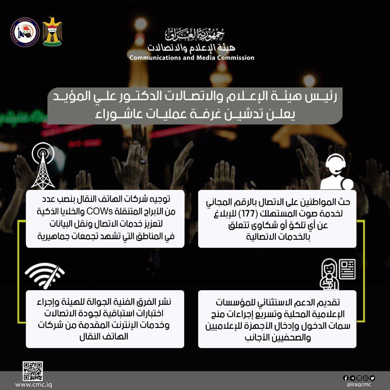 هيئة الإعلام تعلن تدشين غرفة عمليات عاشوراء ونشر عشرات الأبراج والخلايا الذكية