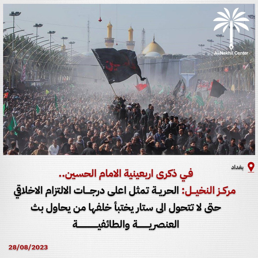 في ذكرى اربعينية الامام الحسين.. مركز النخيل: الحرية تمثل اعلى درجات الالتزام الاخلاقي حتى لا تتحول الى ستار يختبأ خلفها من يحاول بث العنصرية والطائفية
