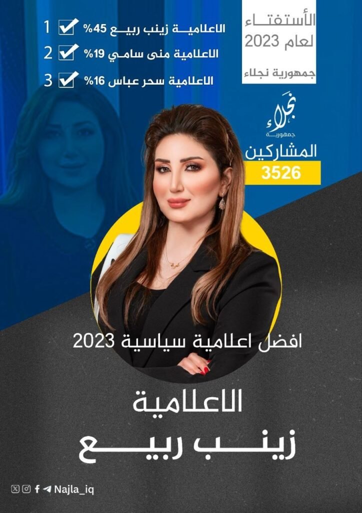 فازت رئيس مركز النخيل للحقوق والحريات الصحفية زينب ربيع كأفضل إعلامية لعام 2023 في الاستفتاء الذي نظمته منصة “جمهورية نجلاء” على التلغرام.