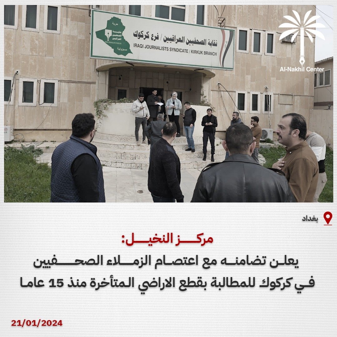 يعلن مركز النخيل للحقوق والحريات الصحفية، عن تأييده وتضامنه الكامل مع الزملاء الصحفيين في محافظة كركوك الذين اعلنوا اليوم اعتصاما مفتوحا أمام مقر البلدية للمطالبة بقطع الاراضي المتأخرة منذ 15 عام.