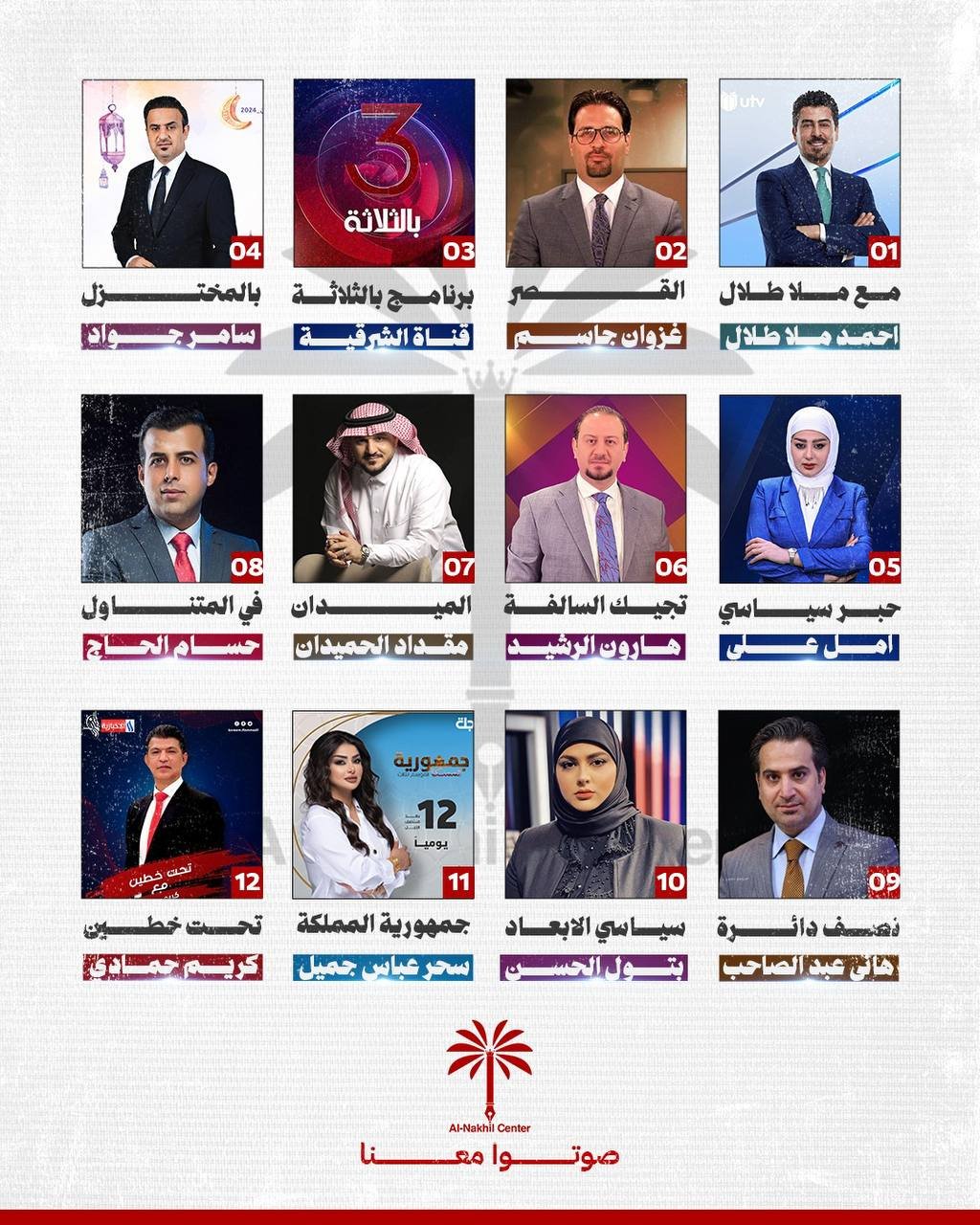 استفتاء مركز النخيل: فوز برامج سامر جواد وغزوان جاسم وبتول الحسن كأفضل برامج سياسية خلال شهر رمضان