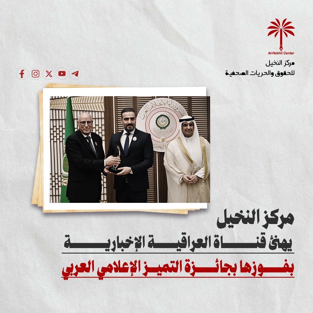 مركز النخيل يهنئ قناة العراقية الإخبارية بفوزها بجائزة التميز الإعلامي العربي