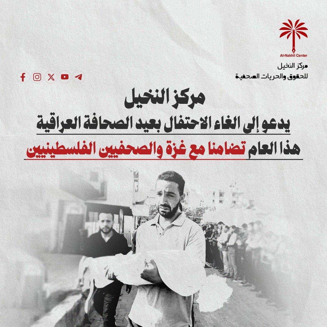 يدعو مركز النخيل للحقوق والحريات الصحفية نقابة الصحفيين العراقيين إلى الغاء احتفالات عيد الصحافة العراقية في 15 حزيران الحالي تضامنا مع غزة وحدادا على ارواح شهداء المجازر الصهيونية.
