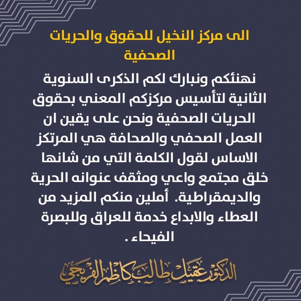 الرئيسية/النخيل نيوز/رئيس اللجنة الامنية في مجلس محافظة البصرة الدكتور عقيل الفريجي يهنئ مركز النخيل للحقوق والحريات الصحفية بمناسبة الذكرى السنوية الثانية لتأسيس المركز النخيل نيوزعامعامنيوز بار رئيس اللجنة الامنية في مجلس محافظة البصرة الدكتور عقيل الفريجي يهنئ مركز النخيل للحقوق والحريات الصحفية بمناسبة الذكرى السنوية الثانية لتأسيس المركز Facebook Messenger Twitter WhatsApp Email