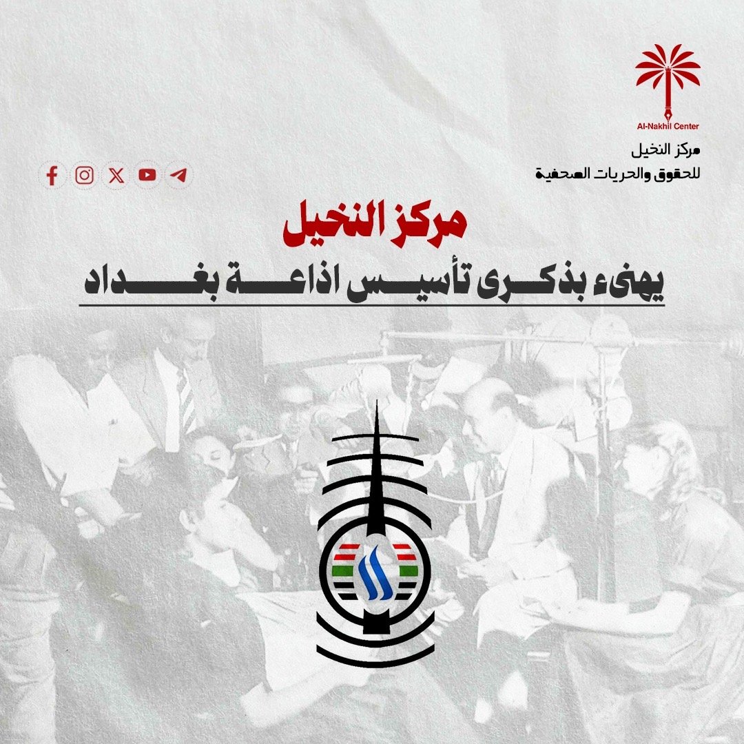 يتقدم مركز النخيل للحقوق والحريات الصحفية، بالتهاني والتبريكات للاذاعيين والاعلاميين العراقيين وشبكة الاعلام العراقي بمناسبة الذكرى السنوية 88 لتأسيس اذاعة بغداد.