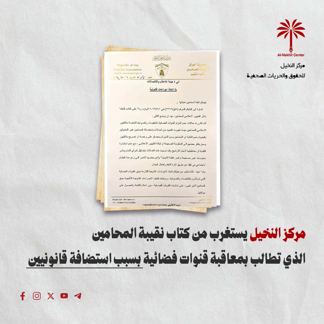 يستغرب مركز النخيل للحقوق والحريات الصحفية من الكتاب الموجه من نقيبة المحامين العراقيين السيدة أحلام اللامي الى هيئة الإعلام والاتصالات والتي تطالب بموجبه باتخاذ الإجراءات القانونية بحق القنوات الفضائية التي تستضيف بعض المحامين والقانونيين للحديث في بعض القضايا القانونية.