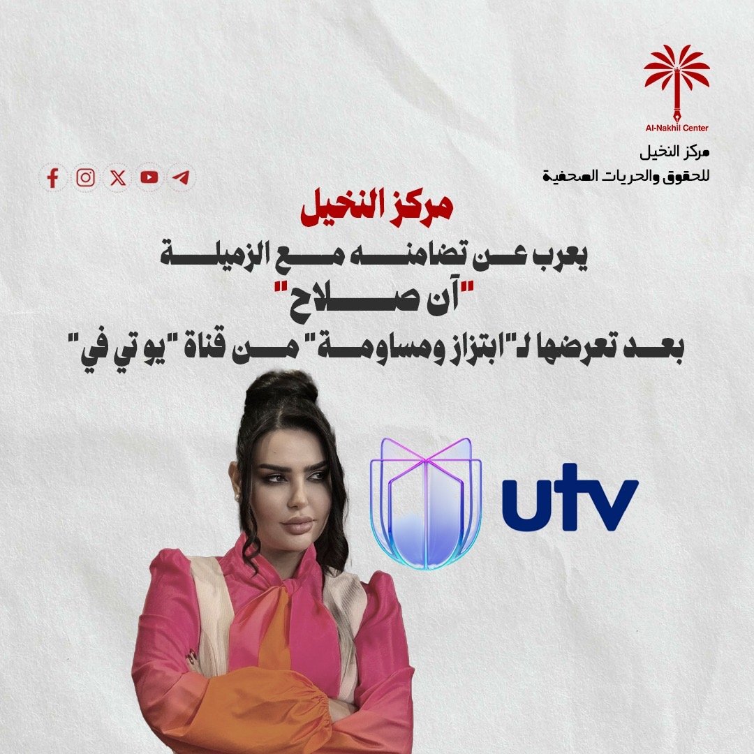مركز النخيل يعرب عن تضامنه مع الزميلة “آن صلاح” بعد تعرضها لـ”ابتزاز ومساومة” من قناة “يو تي في”