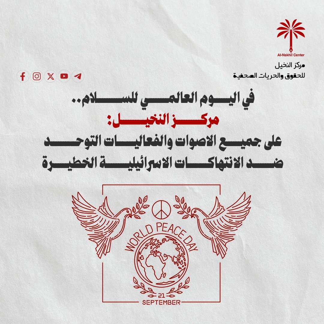 في اليوم العالمي للسلام.. مركز النخيل: على جميع الاصوات والفعاليات التوحد ضد الانتهاكات الاسرائيلية الخطيرة