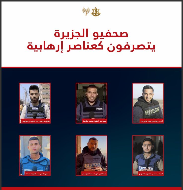 ‏وقد كشف جيش الكيان عن معلومات استخباراتية والعديد من الوثائق التي تم العثور عليها في قطاع غزة، والتي تؤكد الانتماء العسكري لستة صحفيين يعملون في قناة الجزيرة في غزة في صفوف حماس والجهاد الإسلامي وهم: أنس الشريف، علاء سلامة، حسام شبات، أشرف السراج، إسماعيل أبو عمر وطلال العروقي. وتشتمل الوثائق على جداول الموظفين، قوائم لدورات تدريب، كتب هواتف، ووثائق الرواتب للمخربين، والتي تثبت بشكل قاطع أنهم يعملون كعناصر في المنظمات في قطاع غزة.