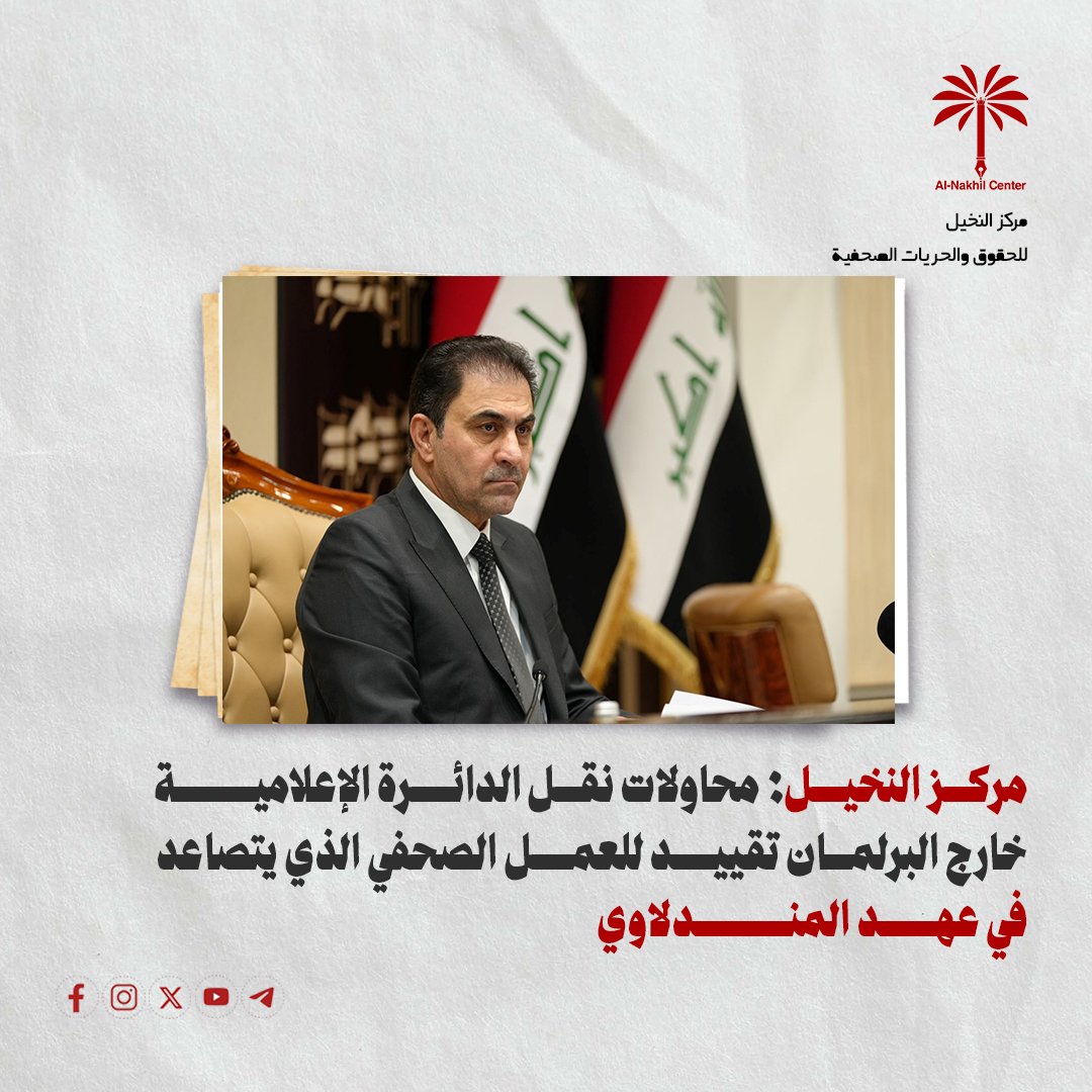 يرفض مركز النخيل للحقوق والحريات الصحفية محاولات نقل الدائرة الإعلامية لمجلس النواب الى خارج المجلس لأسباب مجهولة وغير معروفة وسط انباء تتحدث عن محاولة استثمار المكان من قبل بعض احدى القوى السياسية.