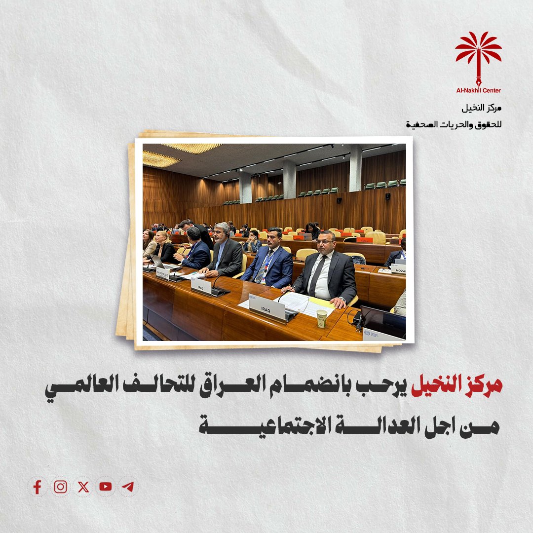 يرحب مركز النخيل للحقوق والحريات الصحفية بإعلان وزير العمل والشؤون الاجتماعية احمد الاسدي بانضمام العراق الى التحالف العالمي من اجل العدالة الاجتماعية والذي يعتبر خطوة مهمة في اطار تعزيز العلاقات مع المجتمع الدولي.