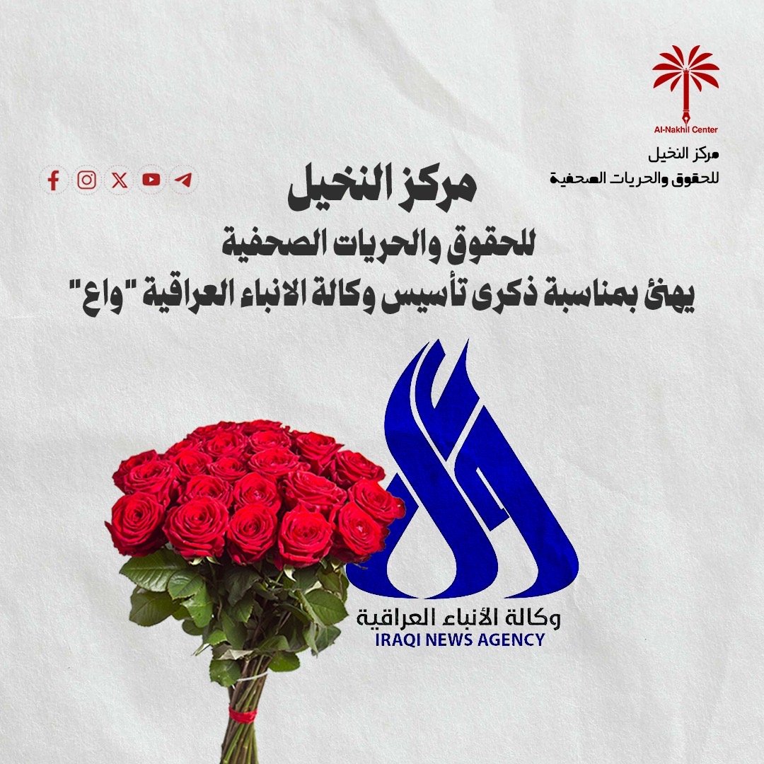 يهنئ مركز النخيل للحقوق والحريات الصحفية الزميلات والزملاء في وكالة الانباء العراقية “واع” بمناسبة الذكرى السنوية لتأسيسها في 9 تشرين الثاني 1959 بقرار من رئيس الوزراء الراحل عبد الكريم قاسم.