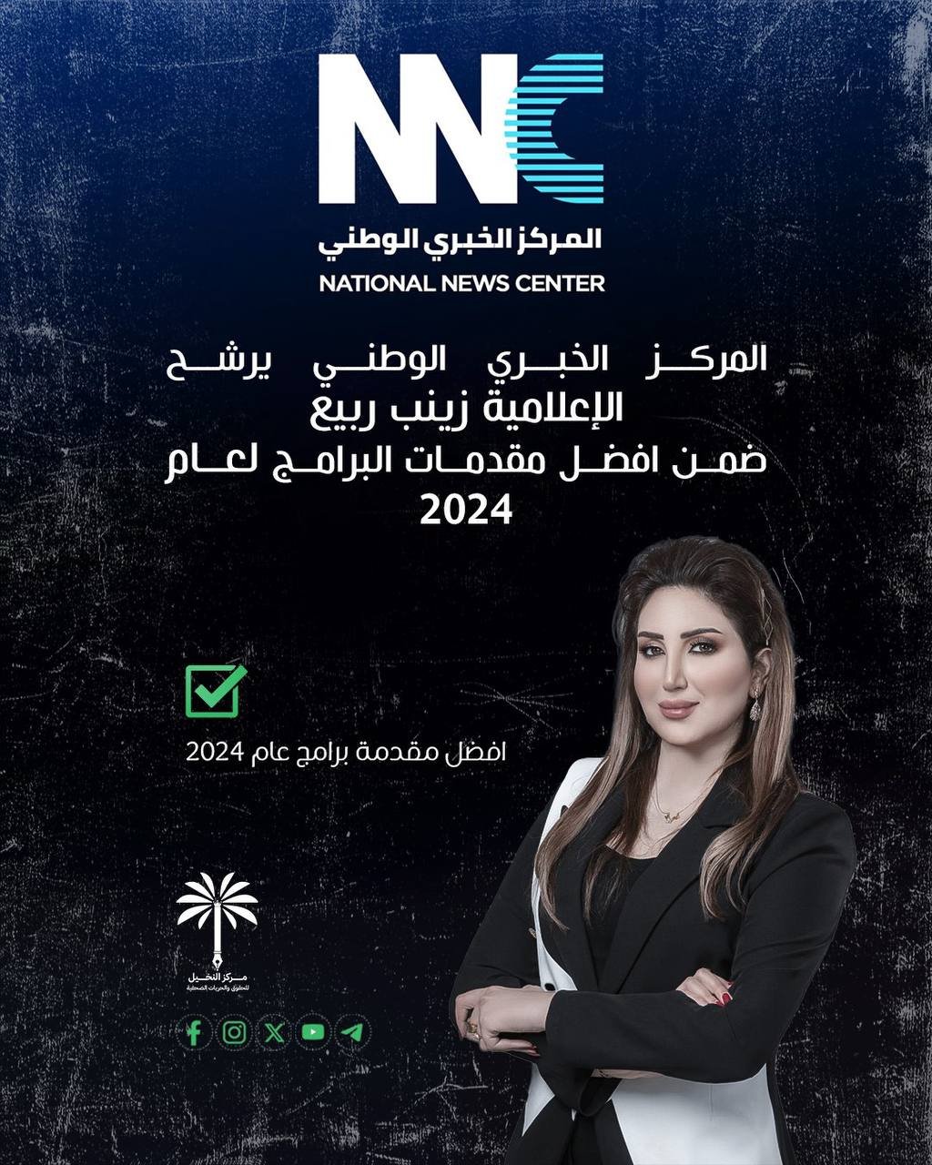 رشح المركز الخبري الوطني، الإعلامية زينب ربيع رئيس مركز النخيل للحقوق والحريات الصحفية كأفضل مقدمة برامج تلفزيونية لعام 2024.