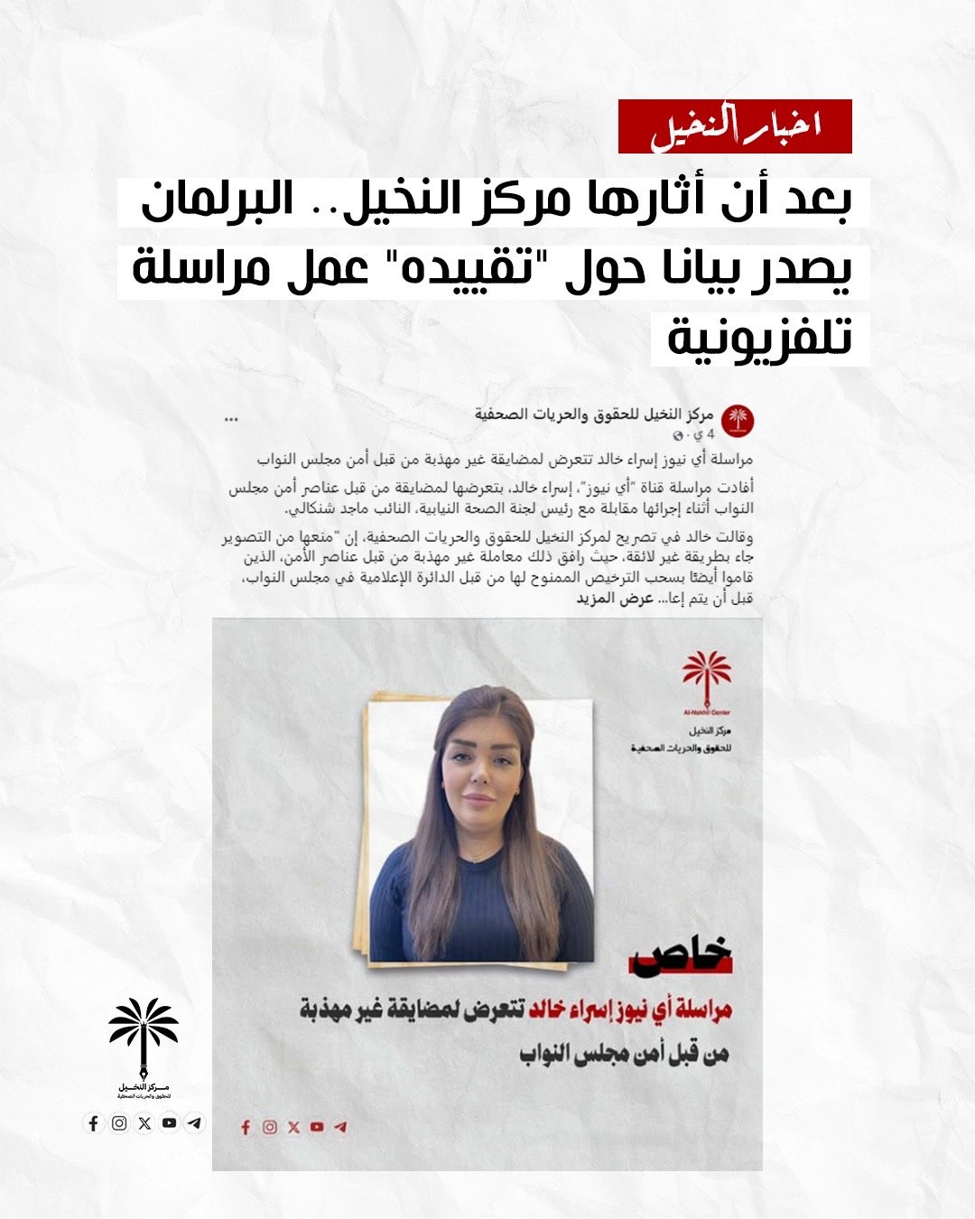 بعد أن أثارها مركز النخيل.. البرلمان يصدر بيانا حول “تقييده” عمل مراسلة تلفزيونية