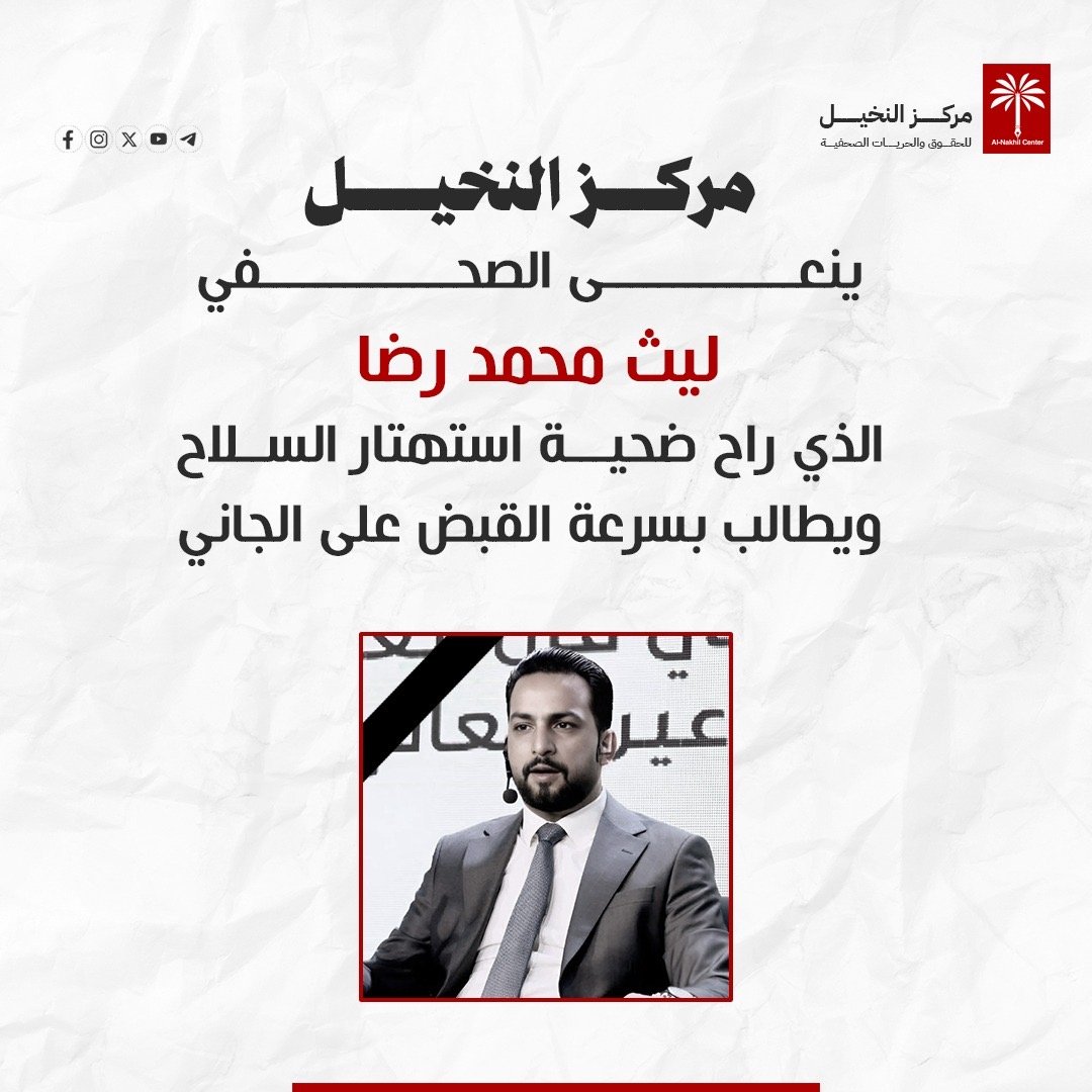 بقلوب يعتصرها الالم والحزن، ينعى مركز النخيل للحقوق والحريات الصحفية الصحفي الاقتصادي ليث محمد رضا الذي قتل برصاص غادر اثر مشاجرة قرب منزلك وسط العاصمة بغداد.