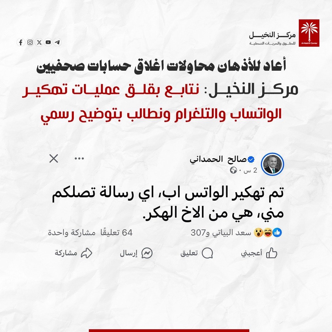 يتابع مركز النخيل للحقوق والحريات الصحفية بقلق عمليات الاختراق والتهكير التي طالت تطبيق الواتساب والتلغرام الخاص بعدد من الصحفيين والناشطين واصحاب الرأي خلال الساعات الماضية، دون صدور موقف رسمي يوضح حيثيات هذه العملية.