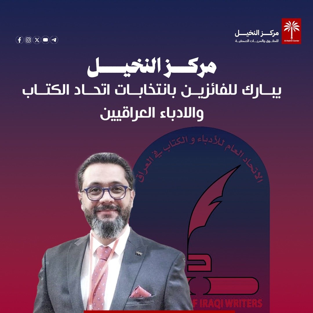 يبارك مركز النخيل للحقوق والحريات الصحفية لجميع الفائزين بانتخابات الاتحاد العام للكتاب والادباء العراقيين.