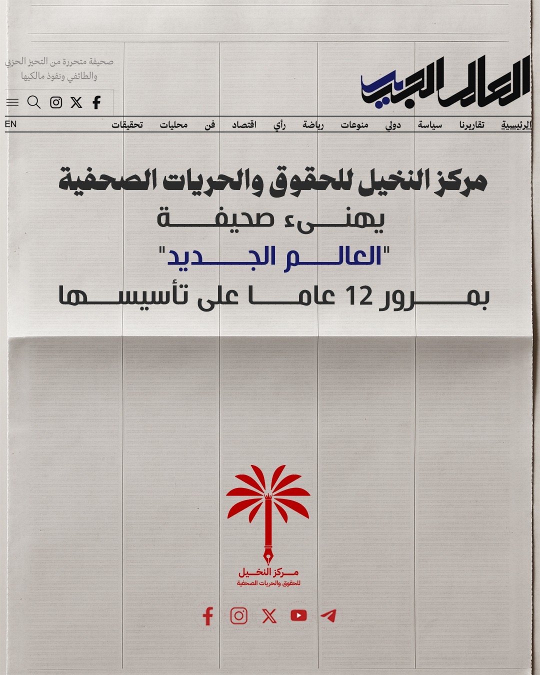 يتقدم مركز النخيل للحقوق والحريات الصحفية إلى الزميلات والزملاء الاعزاء في صحيفة “العالم الجديد” باجمل التهاني والتبريكات بمناسبة مرور 12 عاما على تأسيسها .