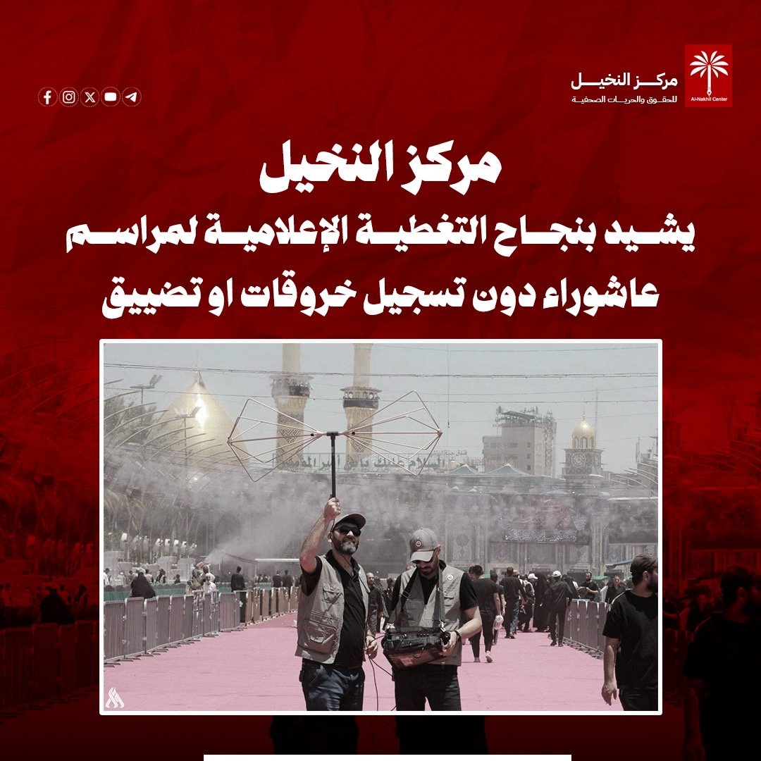 يشيد مركز النخيل للحقوق والحريات الصحفية بالتغطية الإعلامية المتميزة للمؤسسات والكوادر الصحفية المحلية والعربية والاجنبية لمراسم احياء عاشوراء الإمام الحسين (ع) في محافظة كربلاء المقدسة وبقية المحافظات والمدن العراقية.
