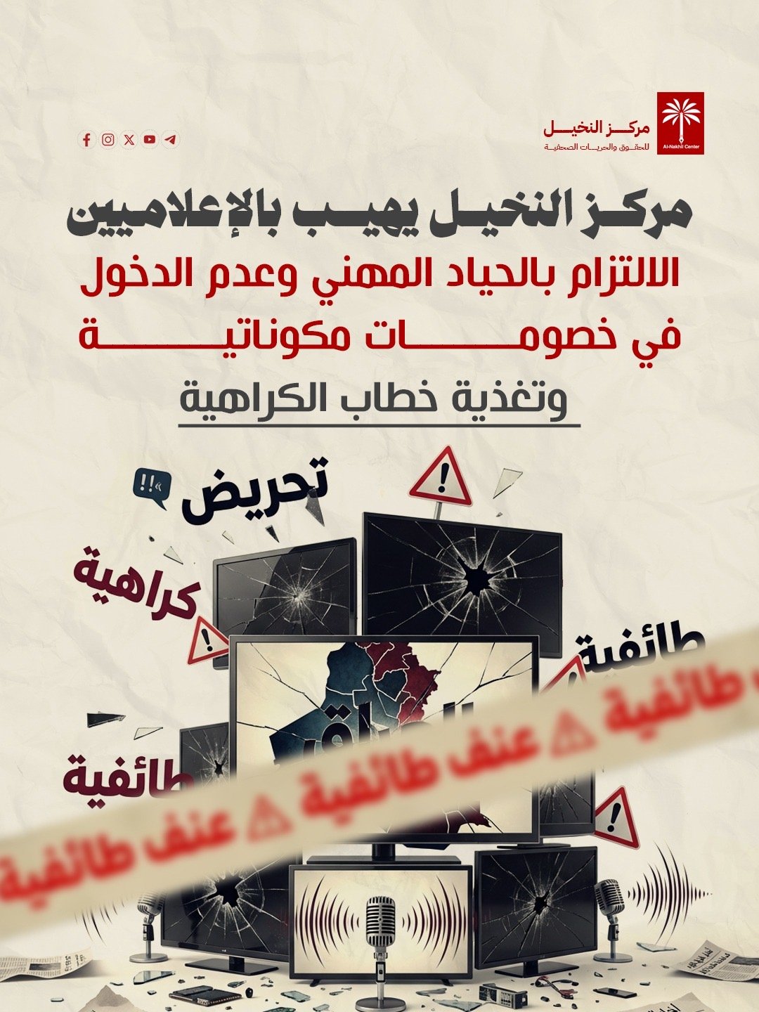 يهيب مركز النخيل للحقوق والحريات الصحفية بالزملاء الإعلاميين ومقدّمي البرامج أن يكونوا على درجة عالية من الوعي المهني، وأن يبتعدوا عن خطاب العنصرية والتفرقة.