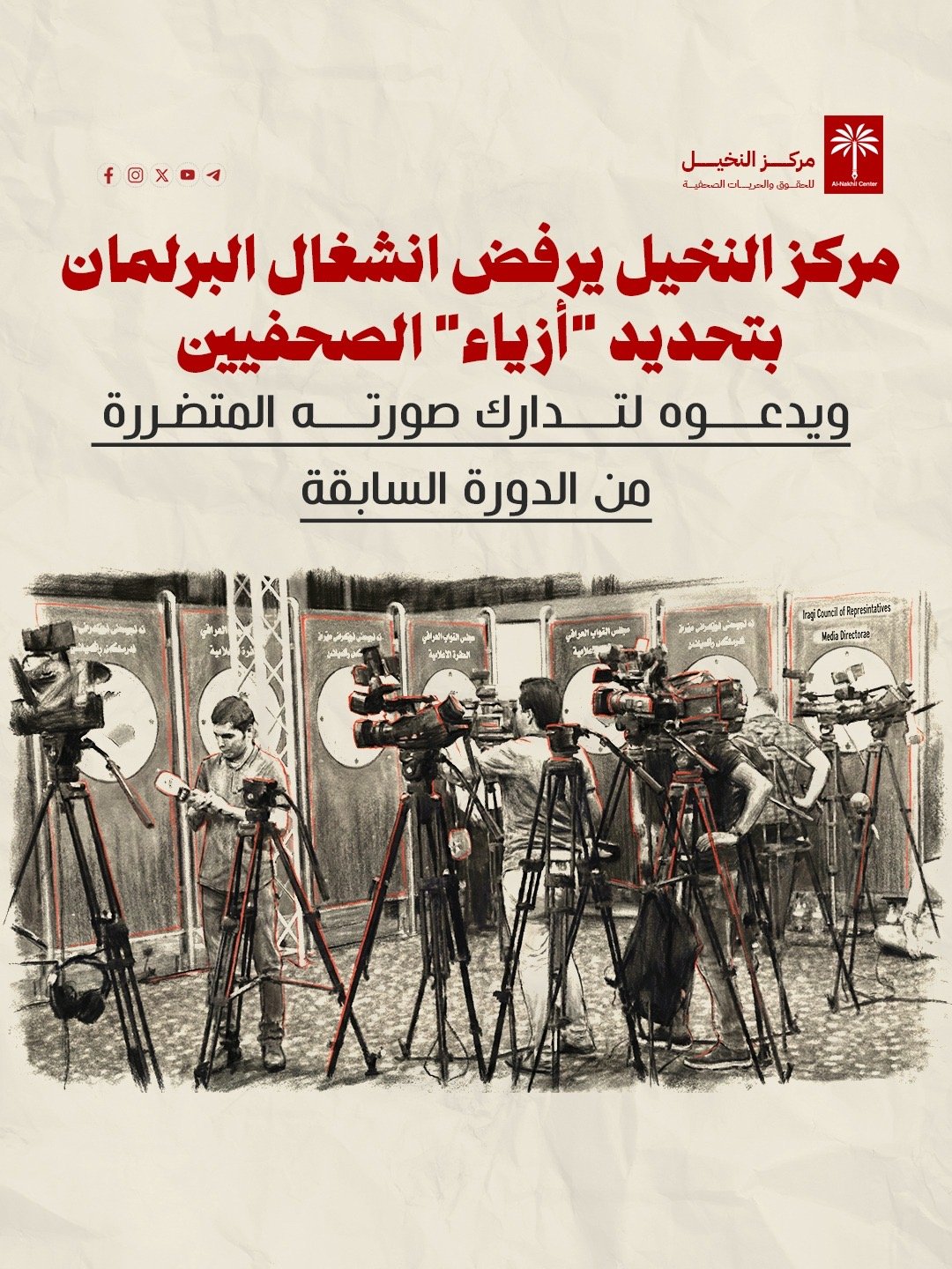 يرفض مركز النخيل للحقوق والحريات الصحفية، قيام رئاسة مجلس النواب بإصدار قرارات تقود للتضييق على تواجد الصحفيين في مجلس النواب، لتسلك بذلك سلوك الرئاسات السابقة التي امعنت في التركيز على ما يؤدي لخنق الوجود الصحفي في مجلس النواب مثل نقل الدائرة الإعلامية الى خارج البرلمان او فرض ضوابط على ما يرتديه الصحفيون.