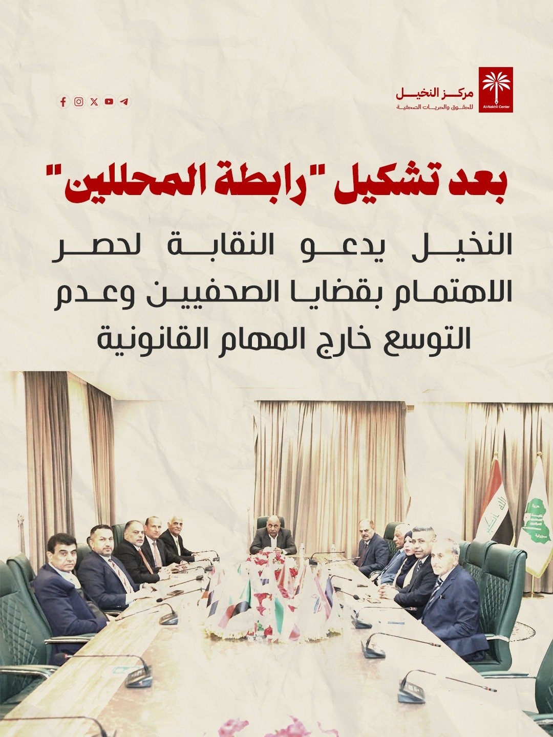 وبينما يثني مركز النخيل على انخراط الادارة الجديدة بالاجتماعات واصدار قرارات لصالح العمل الصحفي وتصحيح مساراته، لكنه يستغرب من اعلان تشكيل “رابطة المحللين”، وهو ما لايدخل ضمن تخصصات العمل الصحفي او مهام النقابة المنصوص عليها في قانون النقابة.
