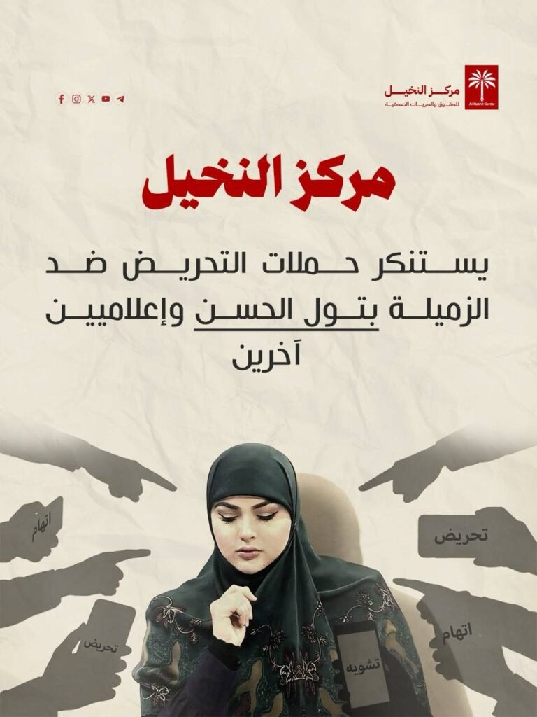مركز النخيل يستنكر حملات التحريض ضد الزميلة بتول الحسن وإعلاميين آخرين