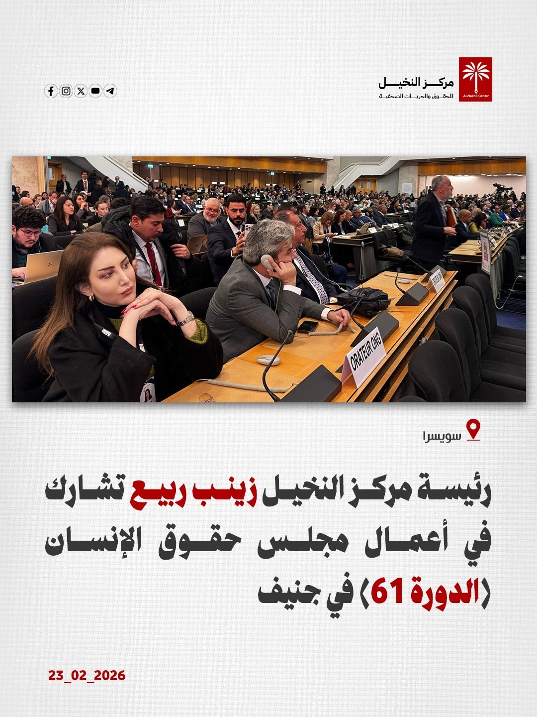 شاركت رئيس مركز النخيل للحقوق والحريات الصحفية زينب ربيع، اليوم الاثنين 23 شباط/ فبراير 2026 في اعمال مجلس حقوق الانسان بدورته الـ61 في جنيف والتي ستناقش جملة من المواضيع المتعلقة بواقع حقوق الانسان.