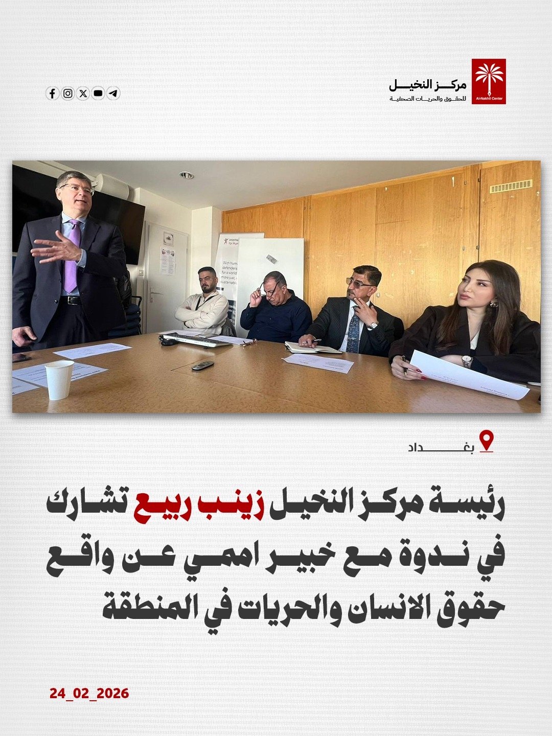 شاركت رئيسة مركز النخيل للحقوق والحريات الصحفية زينب ربيع، اليوم الثلاثاء 24 شباط/ فبراير 2026، في ندوة حقوقية مع الخبير الدولي في الامم المتحدة في مجال حقوق الانسان وتطبيق العدالة السيد “مايكل خامبتا” على هامش أعمال مجلس حقوق الانسان بدورته 61 في جنيف.