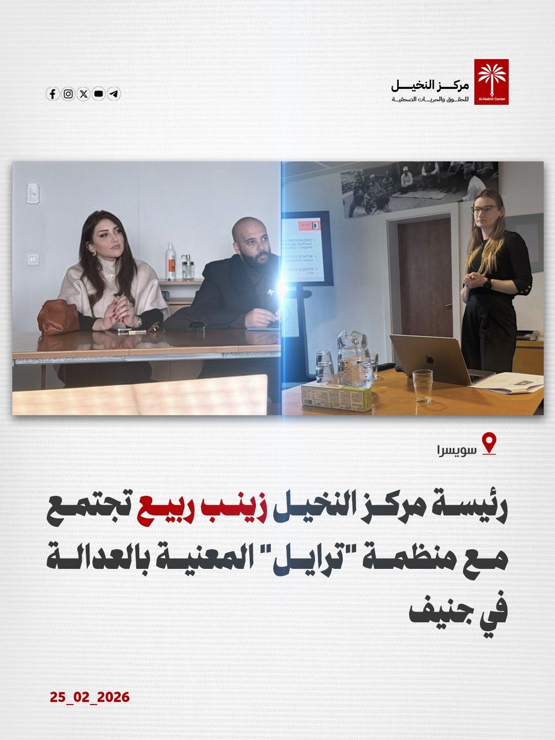 اجتمعت رئيسة مركز النخيل للحقوق والحريات الصحفية زينب ربيع، اليوم الاربعاء 25 شباط 2026، مع منظمة “ترايل” المعنية بالعدالة في جنيف.