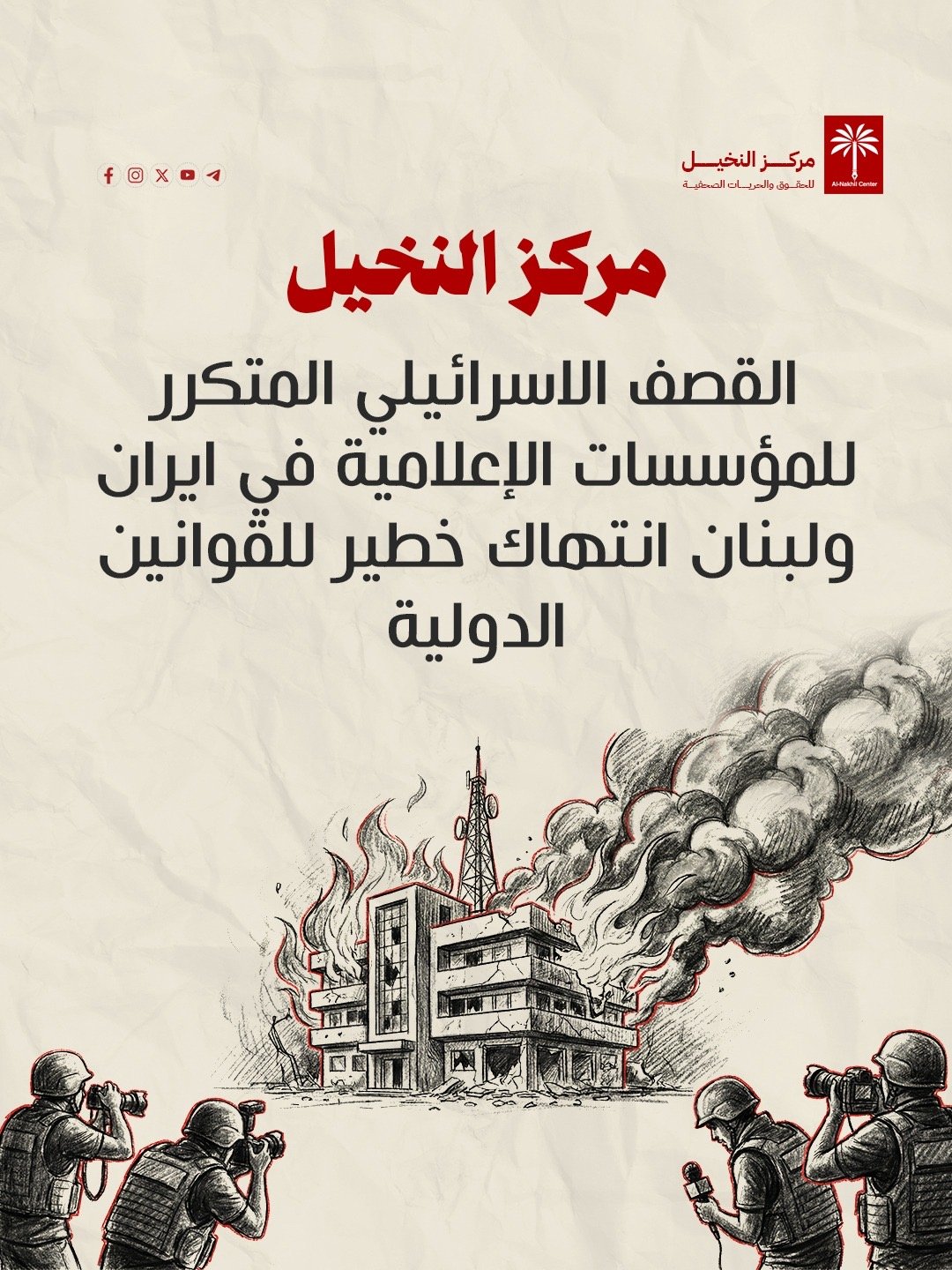 يستنكر مركز النخيل للحقوق والحريات الصحفية، القصف الاسرائيلي على مباني اذاعة النور وقناة المنار وقناة الميادين في العاصمة اللبنانية بيروت، فضلا عن استهداف محيط مبنى هيئة الاذاعة والتلفزيون الإيرانية في طهران.