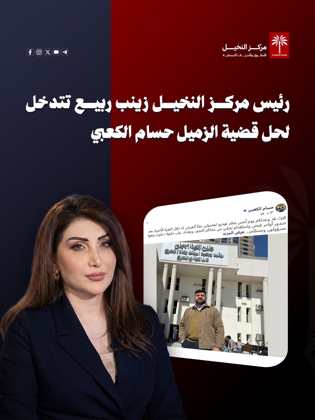 شهدت قضية الصحفي حسام الكعبي تطورات جديدة بعد تدخل مركز النخيل للحقوق والحريات الصحفية برئاسة زينب ربيع، لمتابعة أوامر القبض والاستقدام الصادرة بحقه من محاكم في النجف وبغداد على خلفية دعاوى رفعها عدد من المسؤولين والمستثمرين بسبب تقارير وأخبار صحفية نشرها سابقاً.