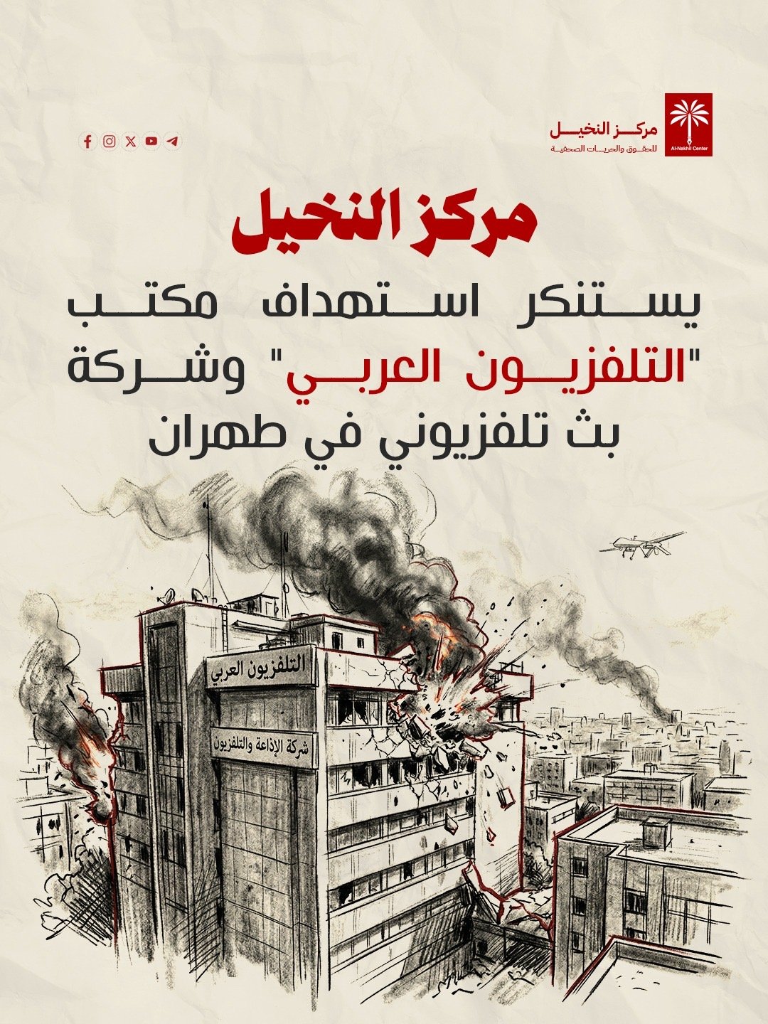 مركز النخيل يستنكر استهداف مكتب “التلفزيون العربي” وشركة بث تلفزيوني في طهران