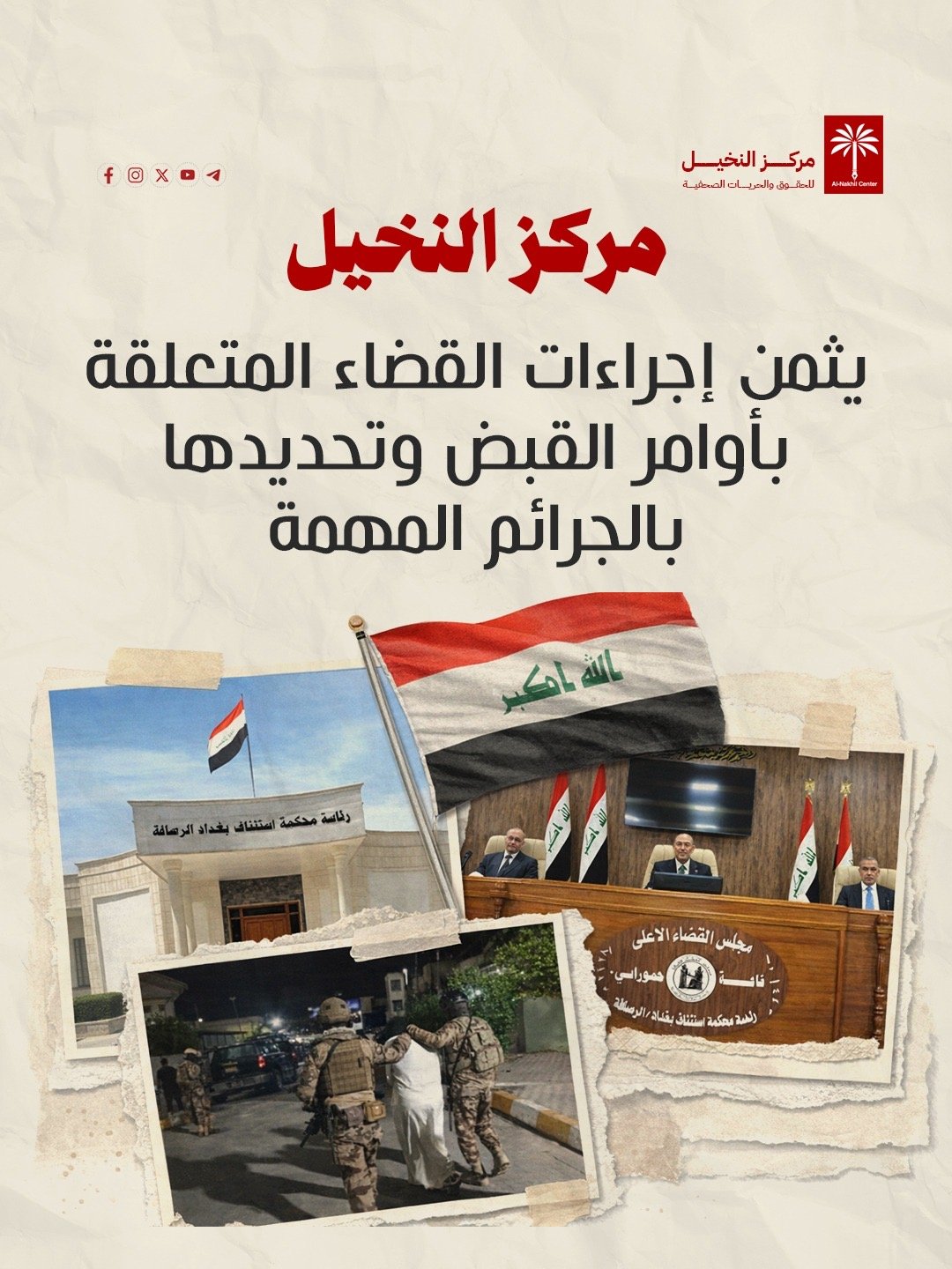 يشيد مركز النخيل للحقوق والحريات الصحفية بتوجيه رئاسة استئناف بغداد / الرصافة القاضي بعدم إصدار أوامر القبض إلا في الجرائم المهمة، لما يمثله من ترسيخ لمبادئ العدالة وصون الحقوق والحريات وحماية أصحاب الرأي.